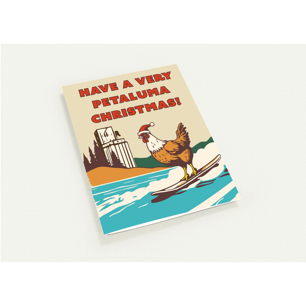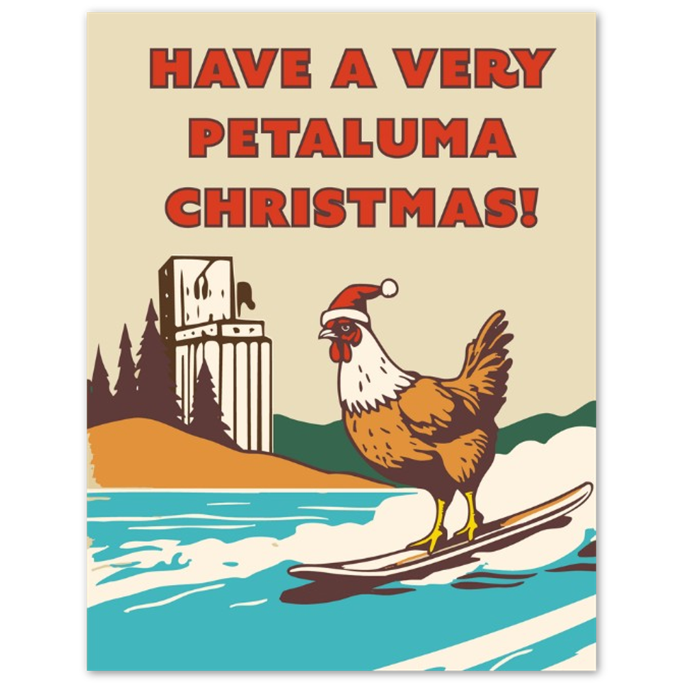 Catch the wave of holiday spirit with our "Surfing Santa Cluck: A Petaluma Christmas" greeting card! This uniquely festive card showcases a Santa-hatted chicken catching the waves, set against a picturesque Petaluma backdrop. It's the perfect blend of local charm and festive fun, ideal for sending warm holiday wishes with a dash of Petaluma pride. Whether for friends, family, or colleagues, this card is sure to bring smiles and a touch of whimsy to anyone's holiday season.